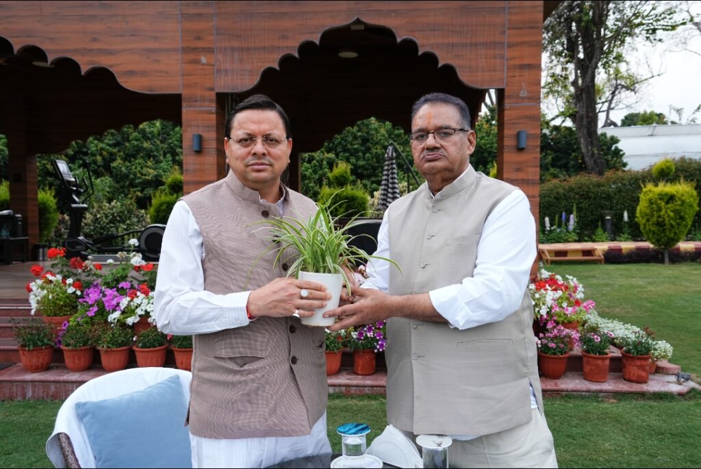 मसूरी क्षेत्र में विकास योजनाओं की स्वीकृति पर मुख्यमंत्री पुष्कर सिंह धामी से भेंट कर उनका धन्यवाद करते कैबिनेट मंत्री गणेश जोशी