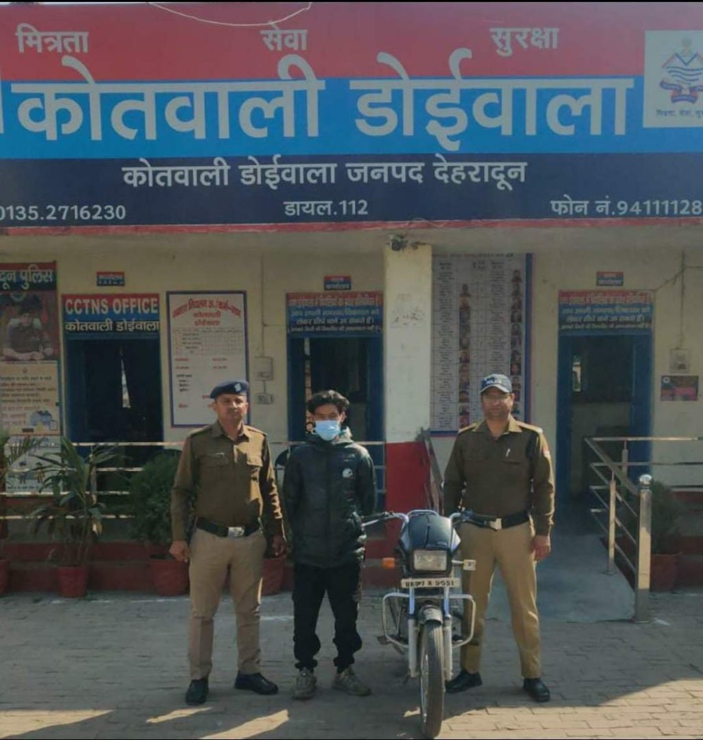 पुलिस द्वारा लगातार किये जा रहे प्रयासों से मुखबिर की सूचना पर दिनांक 20/02/2026 की रात्रि मे पुलिस टीम द्वारा चौकी गेट हर्रावाला बैरियर पर चैकिंग के दौरान अभियुक्त अर्जुन थापा को घटना में चोरी की गयी मो0सा0 सं0- UK07Y-5551 (स्पलेन्डर प्लस) के साथ गिरफ्तार किया गया।